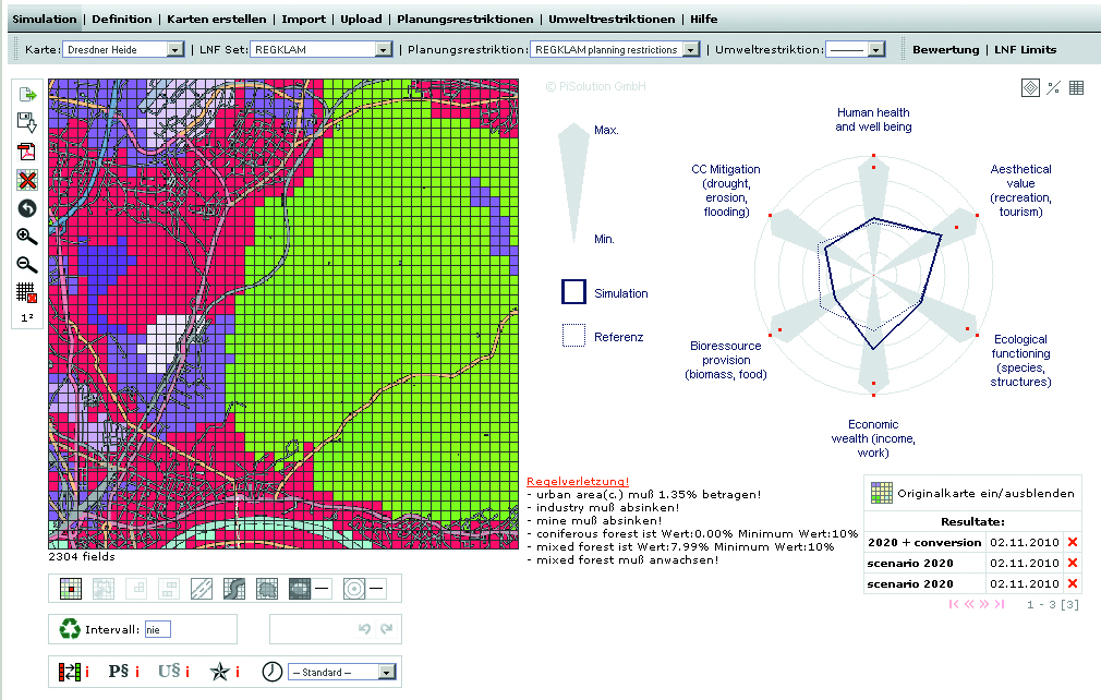 Pimp your landscape gibt es nicht nur als Spiel, sondern auch als wissenschaftliches Instrument zur Planungsfolgenvorabschätzung und zur schnellen Visualisierung der Folgen von Landnutzungsänderungen. Die integrierten Steuerungsmechanismen lassen eine sehr feine Einstellung von Planungsrestriktionen und Umweltrahmenbedingungen zu. Zeitliche Veränderungen können verfolgt werden, Klimaszenarien abgebildet und Höhen-, Temperatur-, Niederschlags- , Erosionsdaten als Profil dargestellt werden. Das System arbeitet nach dem Prinzip eines zellulären Automaten. Sollten Sie sich für dieses System interessieren, können Sie uns gern per mail oder über das Kontaktformular kontaktieren. Wir senden Ihnen gern weitere Informationen zu oder können auch eine Web- Demonstration vereinbaren.